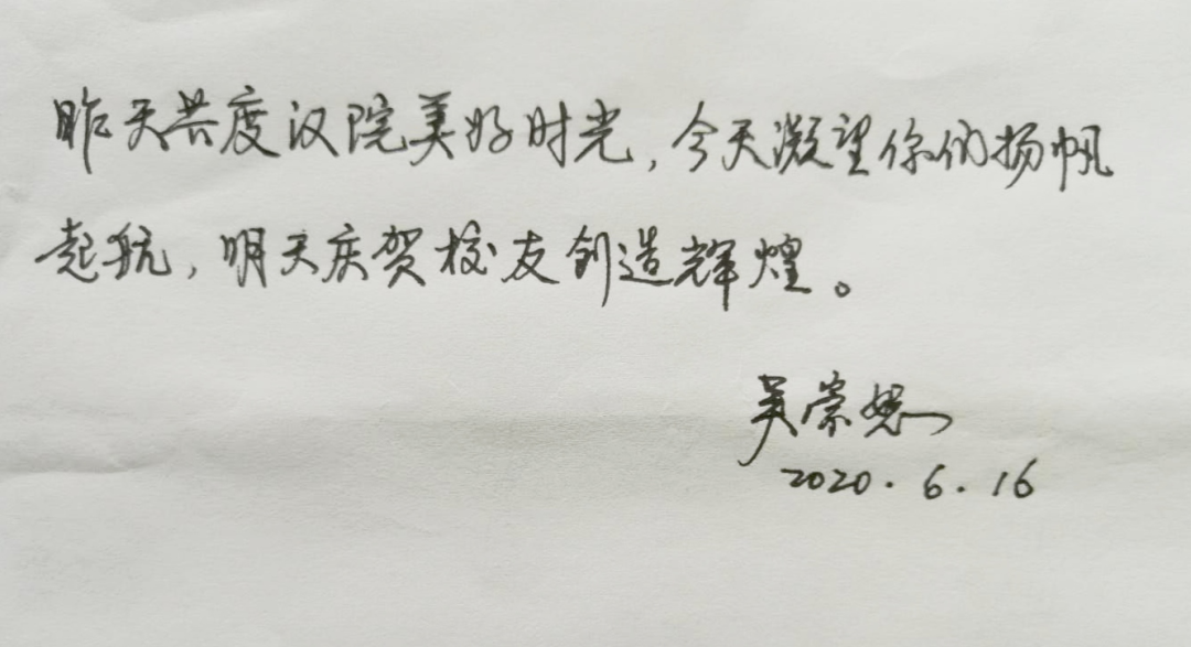 祝贺同学们顺利毕业了!2020年必定是你们人生中特殊且不平凡的一年。春天,还与你们共聚在“课堂”;夏天,却与你们分别在“云端”;你们即将结束汉院的学习,开启人生新的征程,恰同学少年,风华正茂,未来,不论你们是继续学业,还是走上人生新的舞台,母校永远是你们的坚强后盾和精神家园。作为新时代的青年,希望同学们不忘初心、牢记使命,砥砺前行,有时间常回来看看,为母校的发展贡献一份力量!人生路漫漫,衷心地祝福同学们一帆风顺、前程似锦!