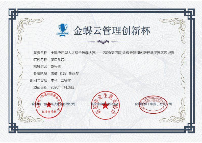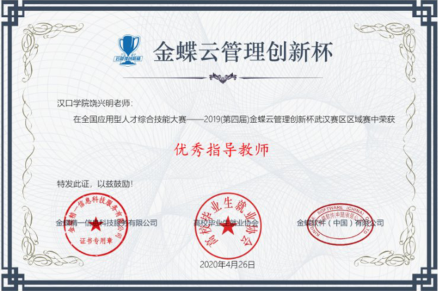 对于学生来说,能在这次不同于传统意义的教育教学中能体现出自律水平的高低。所谓停课不停学,在家的同学也要时刻严格要求自己,按时完成学习任务,主动学习更多专业知识。虽然不能面对面的交流学习,但是通过网络平台展开了一系列学习与拓展,大家利用自己的课余时间展开练习,日复一日,互相鼓励,一起加油,一起学习。通过这么长时间的努力,功夫不负有心人,我们终于取得了金蝶湖北省赛区二等奖的好成绩!为同学们今后学习做好了铺垫。参加这样类别专业比赛,即锻炼了学生,也使老师和同学有了一个很好的成长平台。